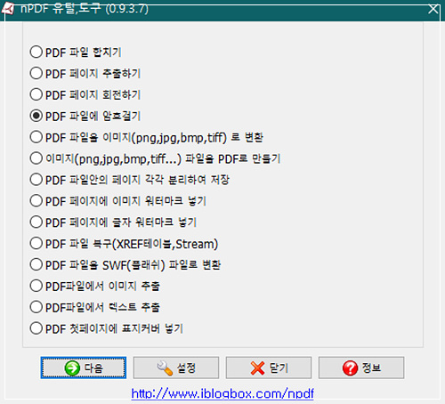 프로그램 실행 화면입니다. ‘PDF 파일에 암호걸기’를 선택 후 ‘다음’으로 넘어갑니다.