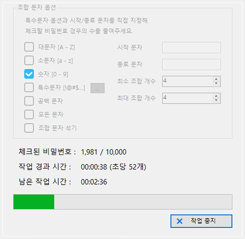 그 다음 아래의 ‘조합 문자 옵션’ 선택란에서 비밀번호 해독에 필요한 힌트를 선택할 수 있습니다. 영어 대문자나 소문자가 사용되었는지, 숫자, 특수문자 등의 사용 여부,혹은 비밀번호 첫자리로 예상되는 문자를 입력할 수 있습니다.