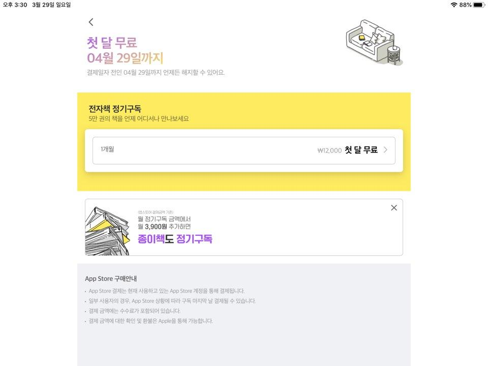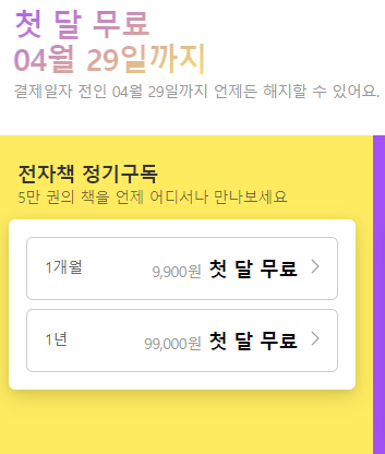 그런데 첫 달 무료 서비스가 끝나면 고스란히 한 달에 9,900원에 달하는 금액을 결제해야합니다. 아무리 첫 1개월을 무료로 이용했다고 하더라도 저렴하다고 할 수는 없는 금액입니다. 요즘같이 구독 경제가 활성화된 시대에는 밀리의 서재 말고도 다달이 나가는 구독료가 분명 있을 테니까요.