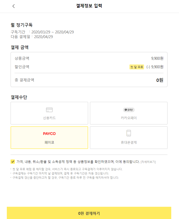 저는 결제 수단으로 페이코 간편결제를 선택했어요. 결제 수단은 여러분이 평소 즐겨 사용하는 방식을 선택하시면 됩니다.