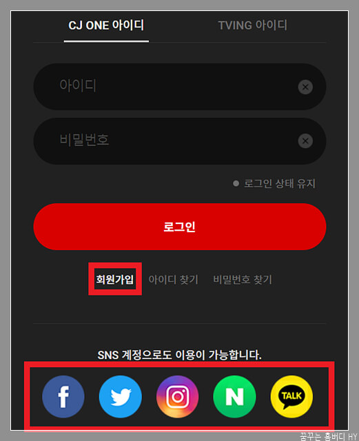 티빙(TVING) 실시간 무료 TV 시청 서비스를 이용하기 위해서는 로그인이 필요해요. 기존 CJ ONE 가입자는 바로 이용 가능하고, SNS 계정으로 빠른 가입도 지원하고 있네요.