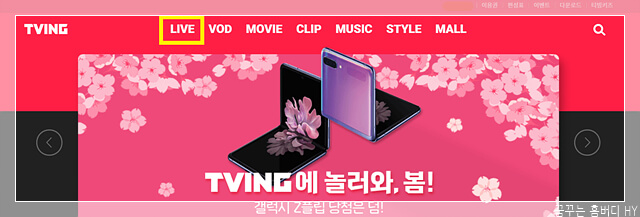 티빙 홈페이지 혹은 모바일 애플리케이션 상단 메뉴 중 'LIVE' 메뉴를 클릭합니다.