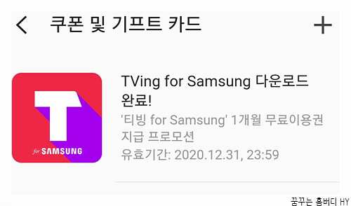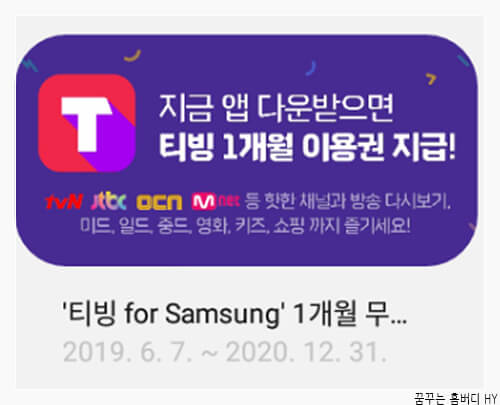 티빙에서는 2019년 삼성 전용 티빙 애플리케이션을 출시하면서 이용자 유입을 위해 갤럭시 스토어에서 '티빙 for Samsung'을 다운로드할 경우 1개월 동안 이용할 수 있는 무제한 이용권을 지급하는 프로모션을 시작했어요.