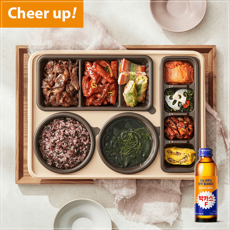 바싹불고기 오징어 한상은 쫄깃하고 매콤한 오징어 볶음과 대표 반찬 바싹불고기가 함께 제공되는 메뉴입니다. 가격은 11,400원이라고 합니다. 고기와 고기의 조합도 물론 좋지만 역시 육고기와 해산물의 조합이 더 균형 잡힌 구성이겠죠? 게다가 지금은 Cheer up! 이벤트로 주문 시 같은 가격에 박카스까지 제공한다고 하니 이왕이면 이벤트 메뉴를 선택하는 것도 좋은 것 같습니다.